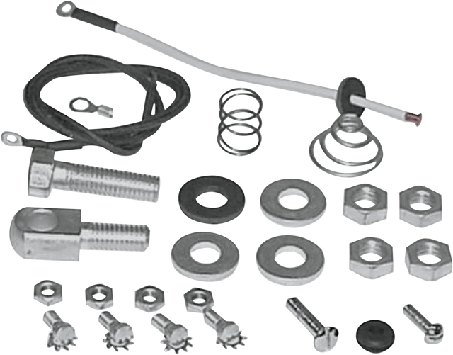 Includes one chrome screw, one chrome screw, one cad post, three cad washers, one fiber washer, one cad swivel bolt, four cad hex nuts, one rubber grommet, one focus spring, two wire leads and rivets