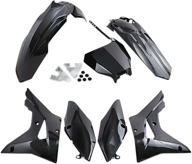 Body kit includes front and rear fender, radiator covers, side panels and front number plate; OEM matches stock bike color