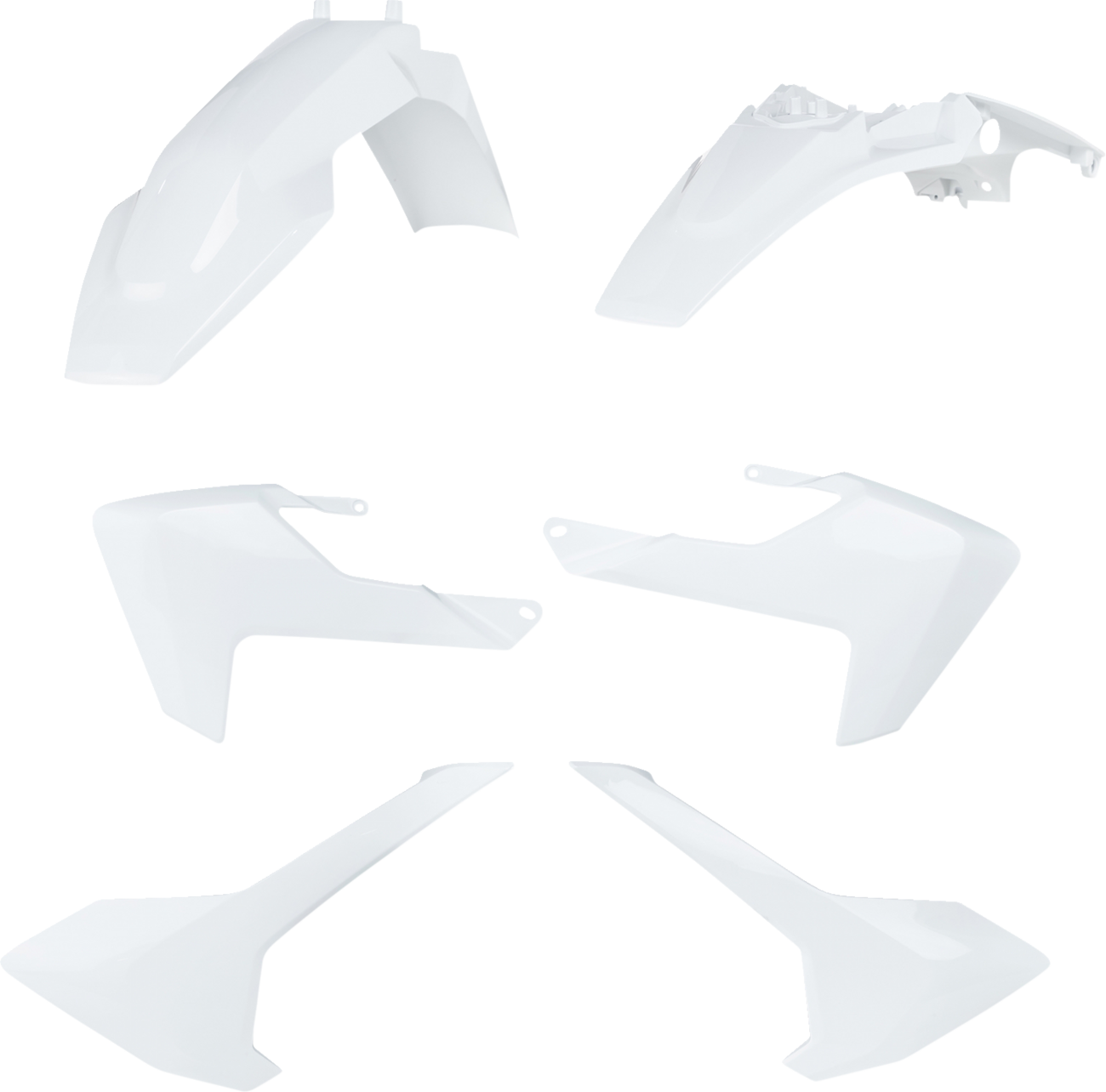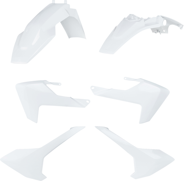 Full kit includes front fender, front number plate, lower fork cover set, radiator shrouds, side panels, and rear fender