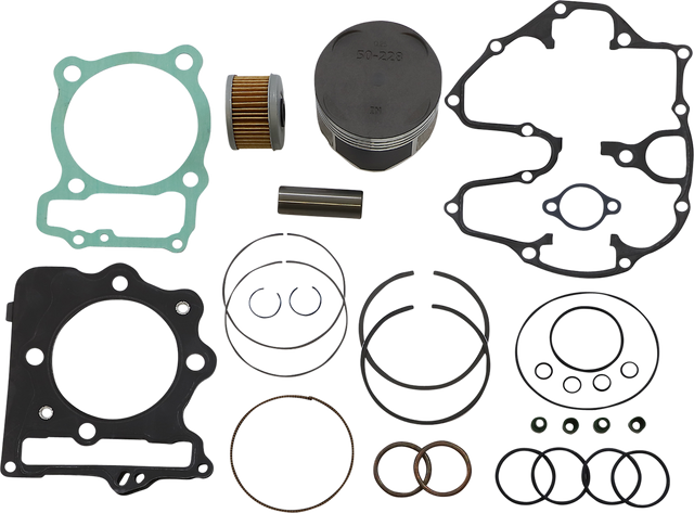 Includes pistons, rings, pins, clips, needle bearings, head and base gaskets and intake and exhaust gaskets and oil filter for 4-stroke models