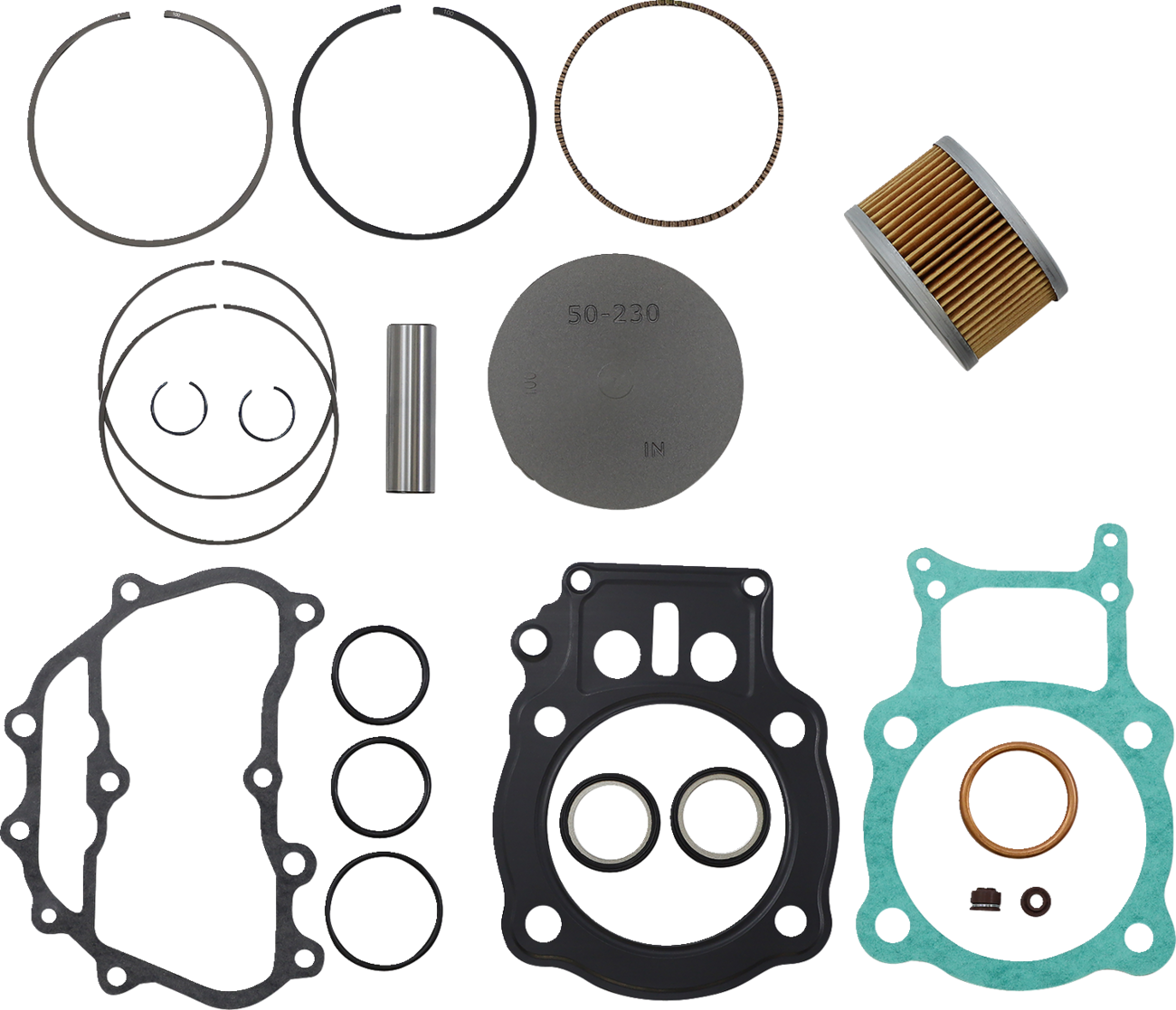 Includes pistons, rings, pins, clips, needle bearings, head and base gaskets and intake and exhaust gaskets and oil filter for 4-stroke models
