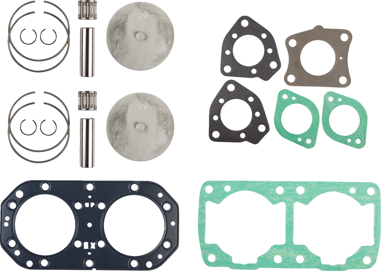 Includes pistons, rings, pins, clips, racing needle bearings, head and base gaskets, intake and exhaust gaskets