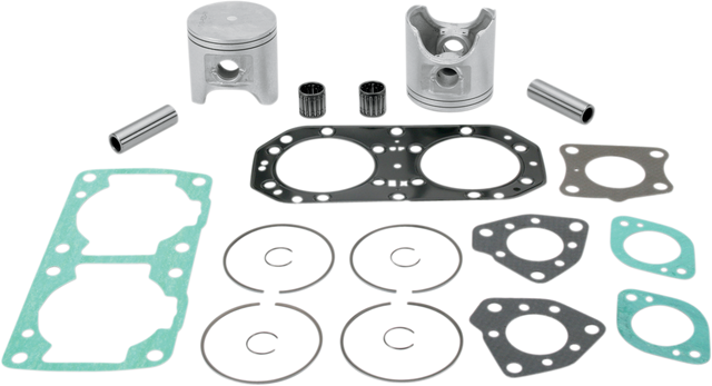 Includes pistons, rings, pins, clips, racing needle bearings, head and base gaskets, intake and exhaust gaskets