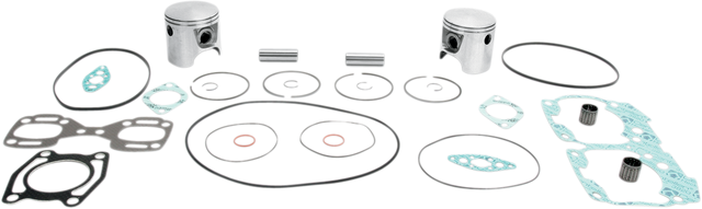 Includes pistons, rings, pins, clips, racing needle bearings, head and base gaskets, intake and exhaust gaskets