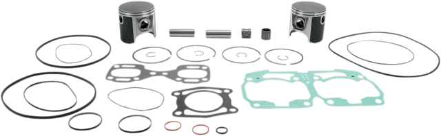 Includes pistons, rings, pins, clips, racing needle bearings, head and base gaskets, intake and exhaust gaskets