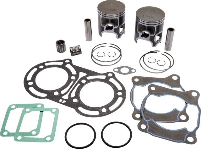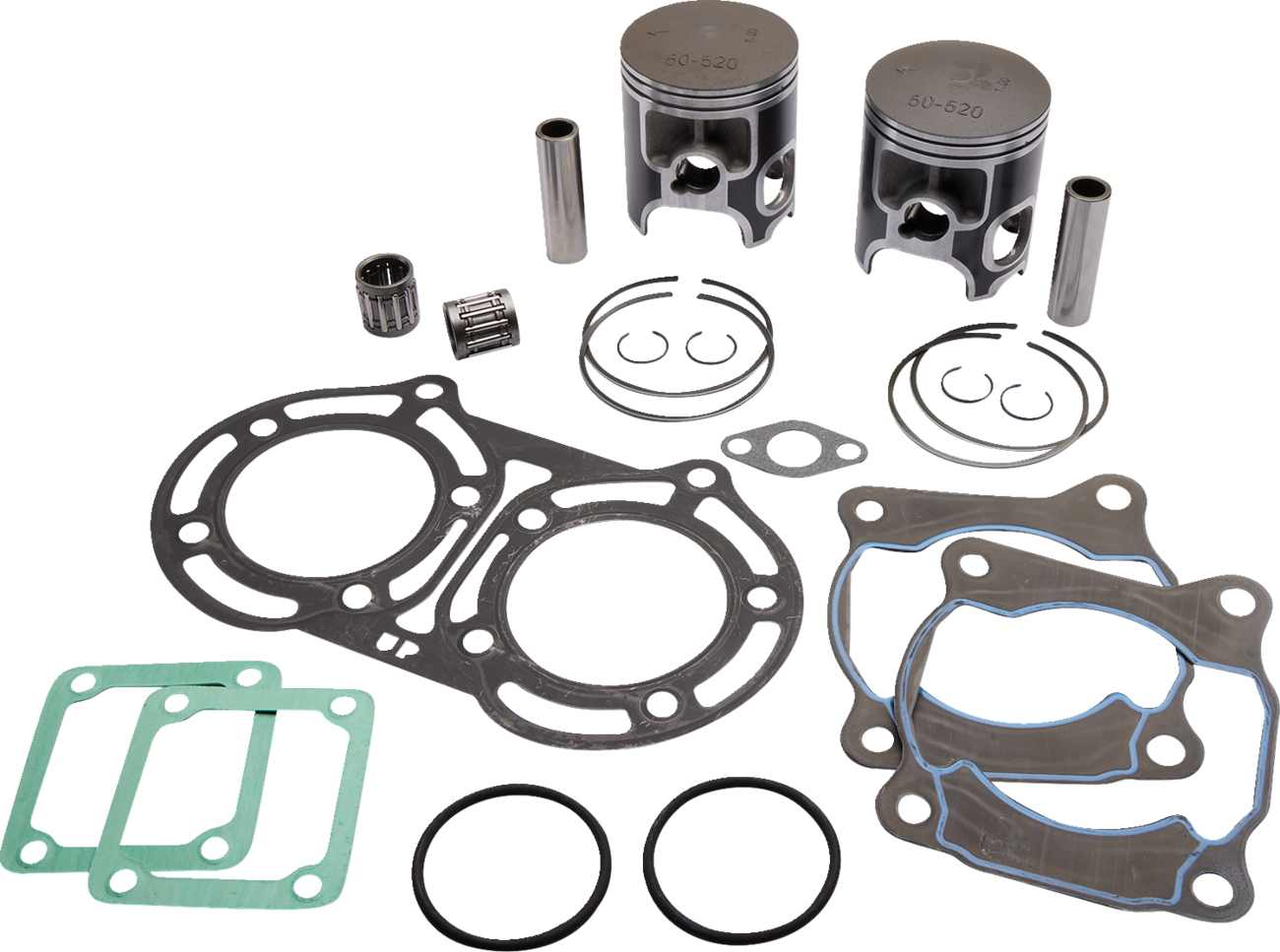Includes pistons, rings, pins, clips, racing needle bearings, head and base gaskets, intake and exhaust gaskets