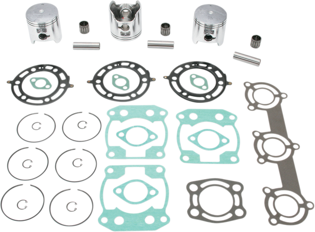 Includes pistons, rings, pins, clips, racing needle bearings, head and base gaskets, intake and exhaust gaskets