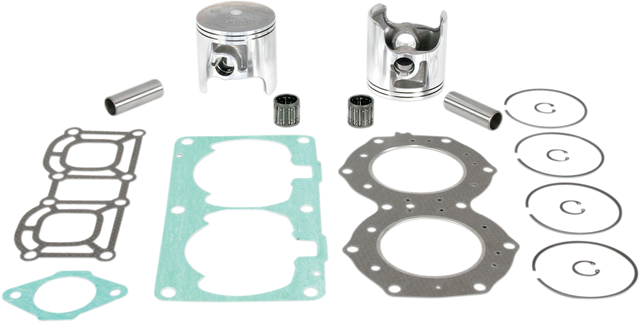 Includes pistons, rings, pins, clips, racing needle bearings, head and base gaskets, intake and exhaust gaskets