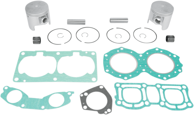 Includes pistons, rings, pins, clips, racing needle bearings, head and base gaskets, intake and exhaust gaskets