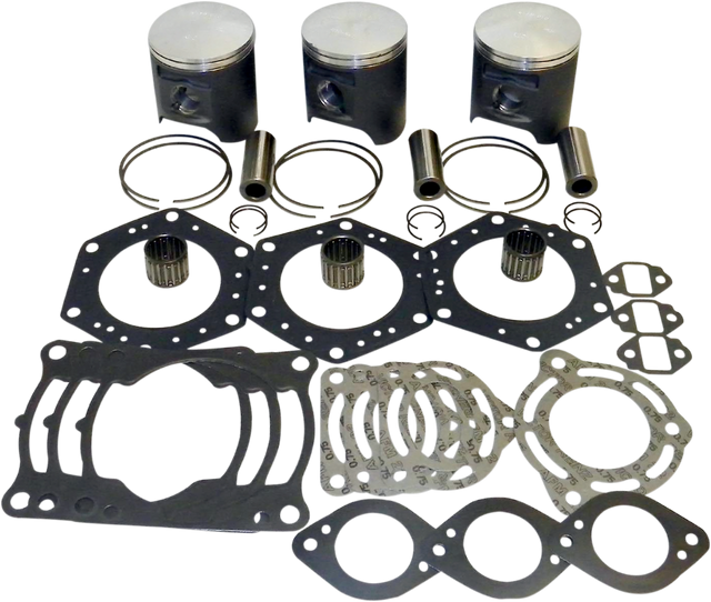 Includes pistons, rings, pins, clips, racing needle bearings, head and base gaskets, intake and exhaust gaskets