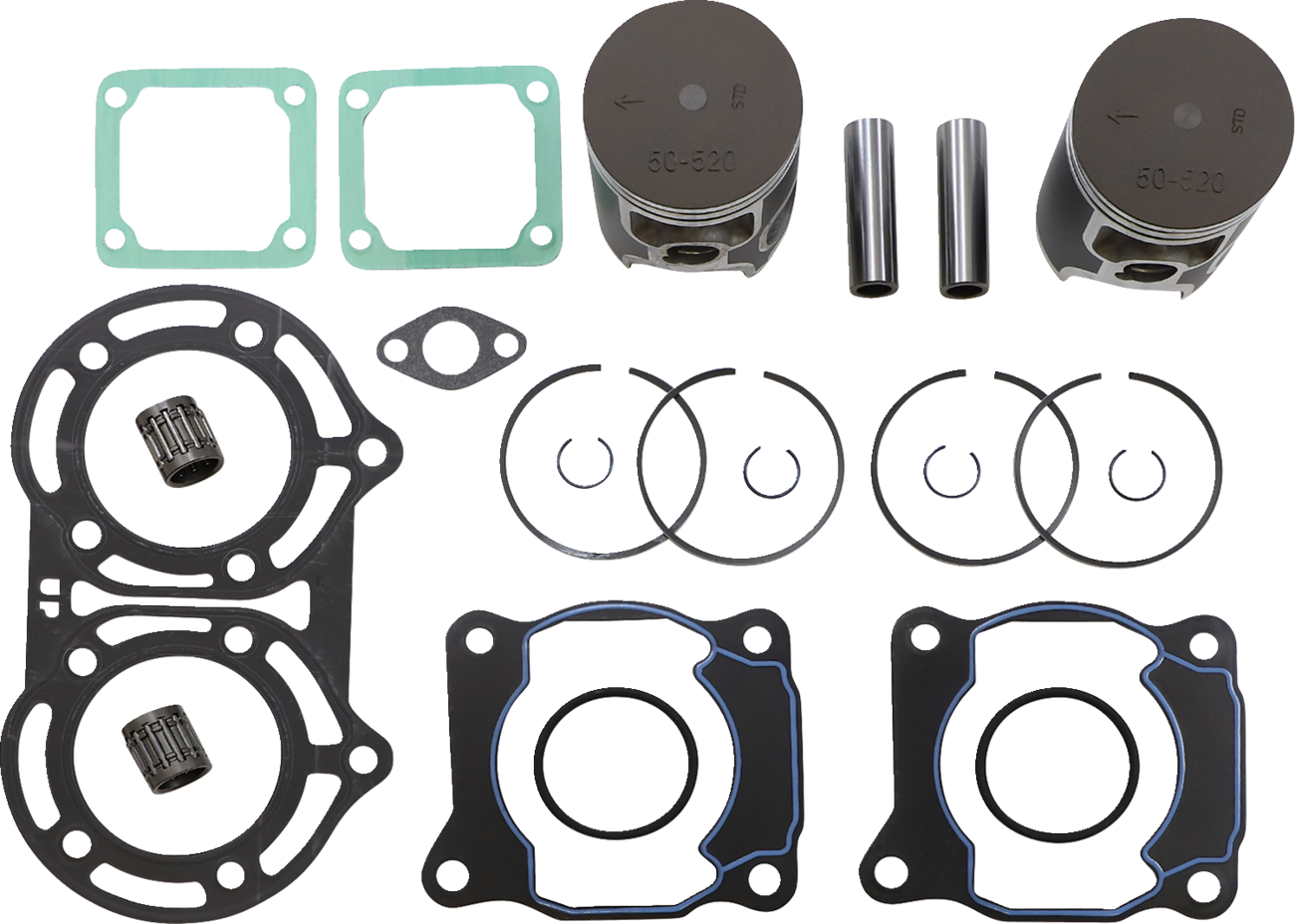 Includes pistons, rings, pins, clips, racing needle bearings, head and base gaskets, intake and exhaust gaskets
