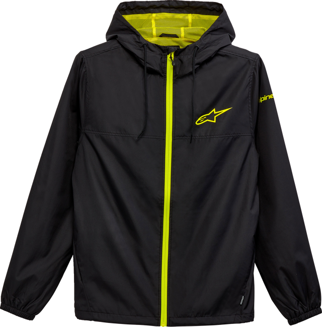 On seam hand pockets, bungie adjusters at hem, elastic cuffs